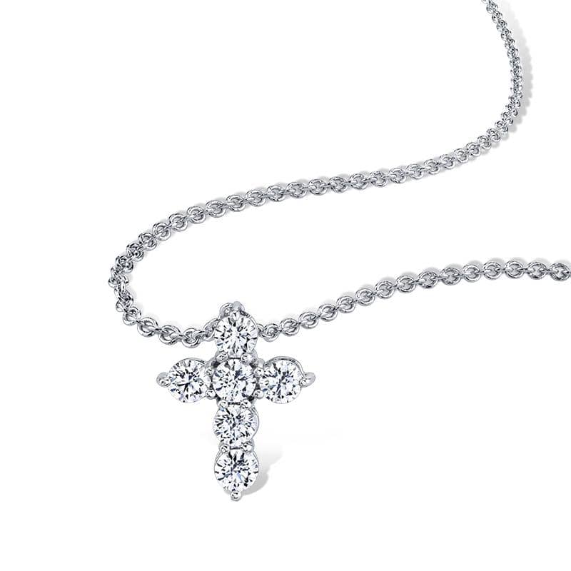 Custom made six diamond cross featuring 1.07 carats total weight in round brilliant cut diamonds set in platinum with a 1.3mm round adjustable cable chain.