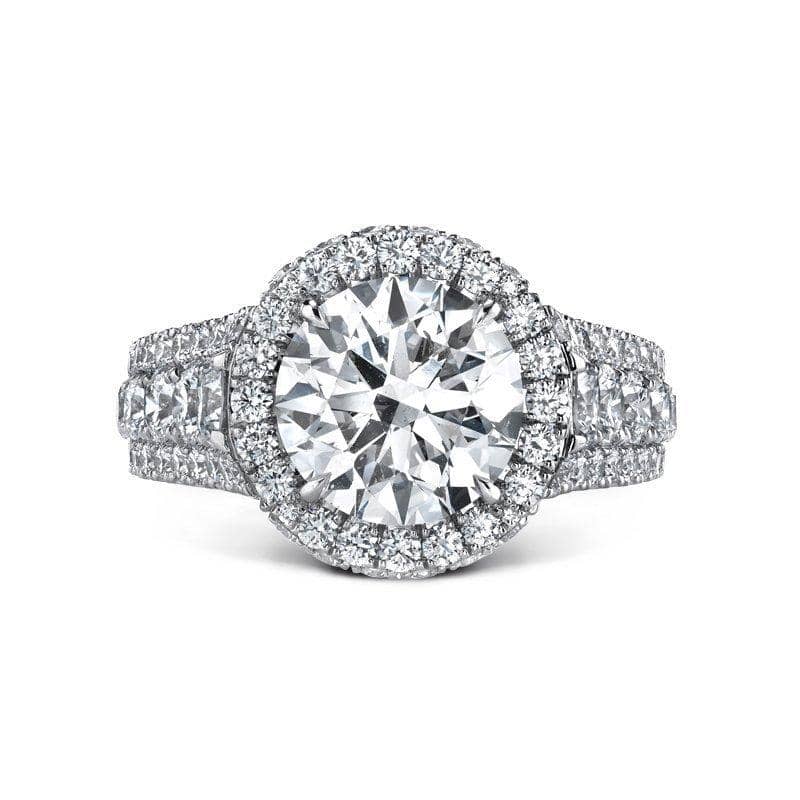 Custom made ring featuring a 3.01 carat round brilliant cut diamond. This ring features a sparkling round brilliant cut center diamond, crafted with a special focus on carat weight with 2.46 carats total weight in round brilliant cut diamond accents set in platinum.Original: $73,000.00