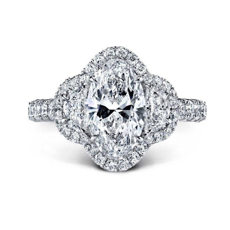Custom made ring featuring a 2.00 carat oval shaped diamond center with .49 carats total weight in half moon diamonds and .91 carats total in round brilliant cut diamonds set in platinum.