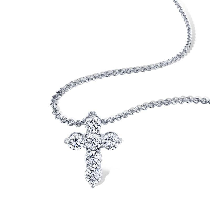 Custom made six diamond cross featuring 1.50 carats total weight in round brilliant cut diamonds set in platinum with a 1.3mm round adjustable cable chain.